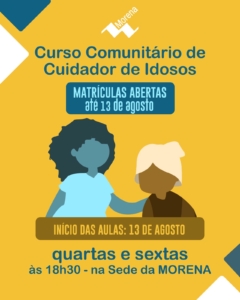 A MORENA informa, com muita satisfação, que estão abertas as inscrições para uma nova turma do Curso Comunitário de Cuidador de Idosos, até o próximo dia 13 de agosto, dia do início das aulas (às quartas e sextas, das 18h30 até 20h30).